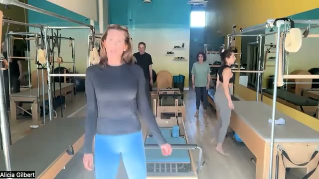 Alicia Gilbert in a Pilates studio with clients and reformer equipment